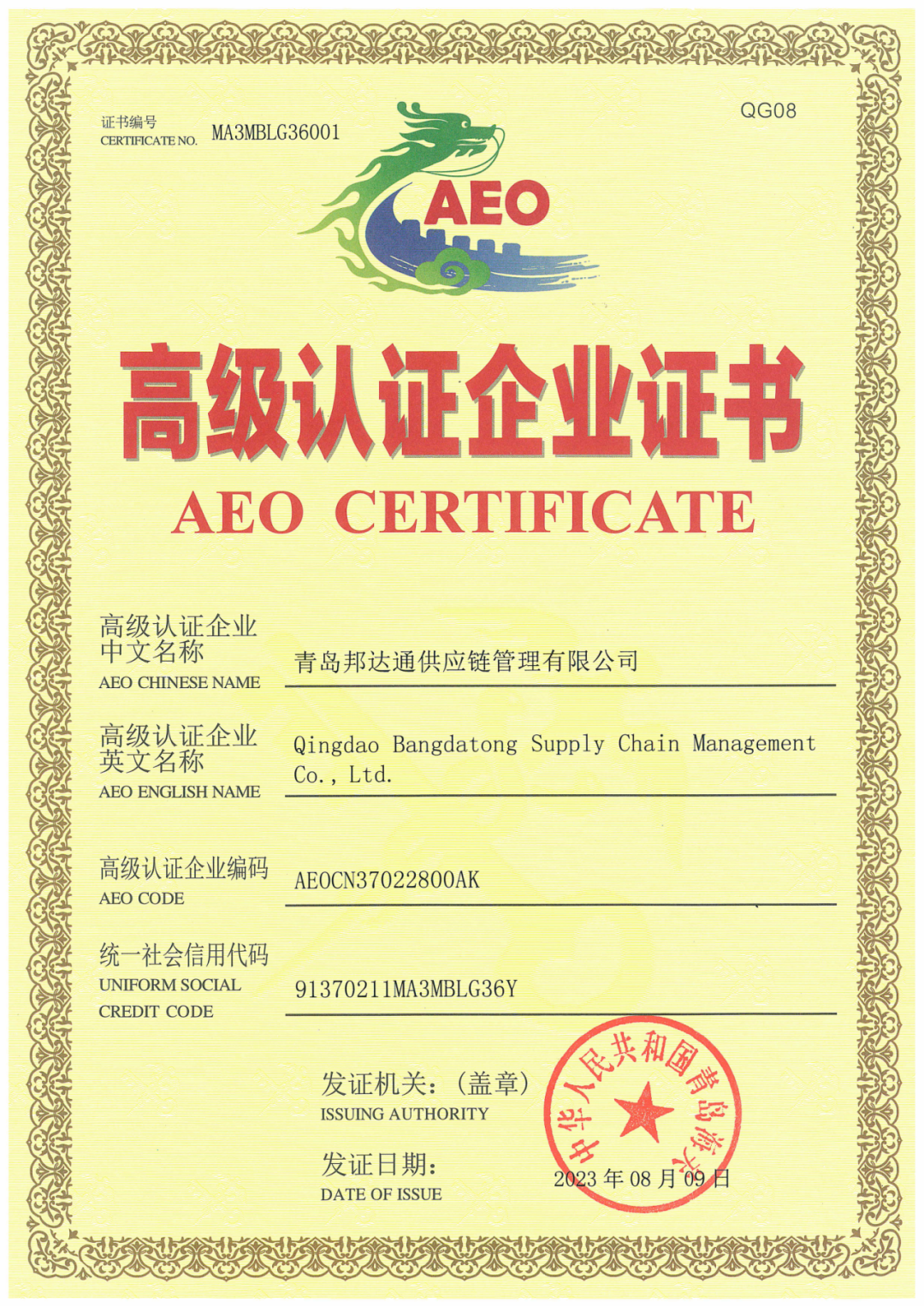 祝贺青岛邦达通供应链管理有限公司正式成为中国海关AEO高级认证企业