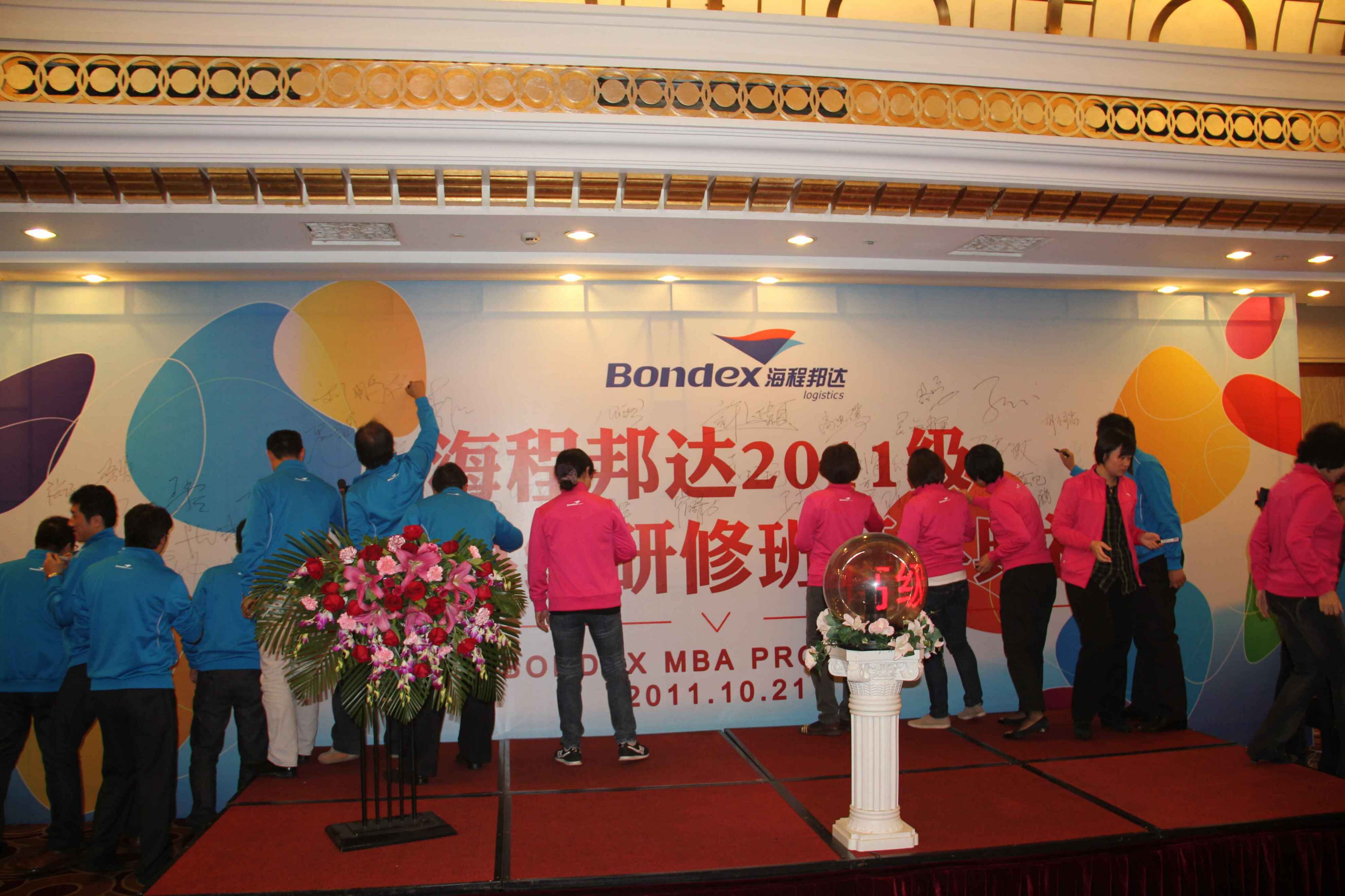 海程邦达MBA班开学典礼暨首次课程于2011年10月21-23日期间在青岛举行,公司领导唐总、高总、张总、吴总、马总及本项目承办单位众拓灌能咨询公司许董等人出席了开学典礼仪式,来自公司各部门及各分公司的五十余位学员参加了典礼。21日上午8时30分,开学典礼在大家的热切期盼中拉开了帷幕。首先项目总负责人、公司总裁唐海先生就公司发展目标及干部培养计划做了鼓舞人心的讲话,紧接着许董、高总两位教务督导分别就项目师资、服务保障做了介绍,并表达了对学员的要求和期望。在热烈的音乐氛围中,唐总、许董、高总共同启动了水晶球,宣布海程邦达2011级MBA高级研修班正式启动。随后,唐总公布了由学员投票选举产生的班委会名单,并将班旗授予班长路鸣;路鸣手持班旗带领全体学员庄严宣誓:“... ...虚怀若谷,学以致用;勇于迎接更高的挑战!”