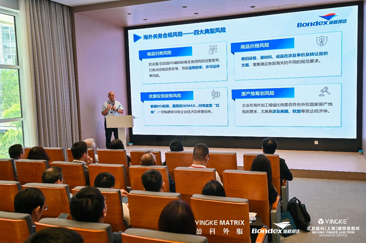 随后,海程邦达集团关务总监翟明先生带来《企业出海关务合规场景及海外合规资源筹划》的精彩演讲,为参会企业详细阐述了海外关务合规的复杂性与重要性。翟明指出,企业在“走出去”的过程中,面临着商品归类风险、商品价格风险、优惠投资政策风险以及原产地筹划风险等四大典型关务合规风险,并通过案例讲解,让参会企业深刻认识到关务合规的紧迫性和严峻性。